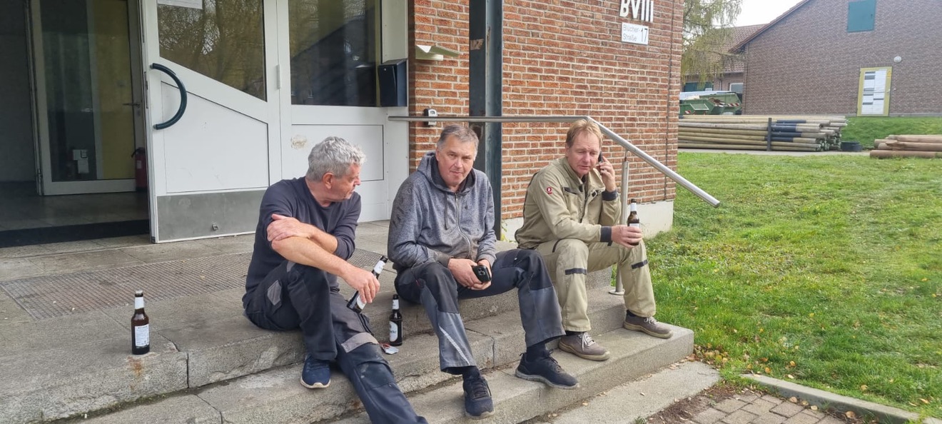Thomas H., Rainer K. und Michael S. gönnen sich eine kurze Pause und wärmen sich am alten Bollerofen. Auch wenn die Arbeit anstrengend ist – der Zusammenhalt und die gemeinsame Vision machen jede Anstrengung wert.